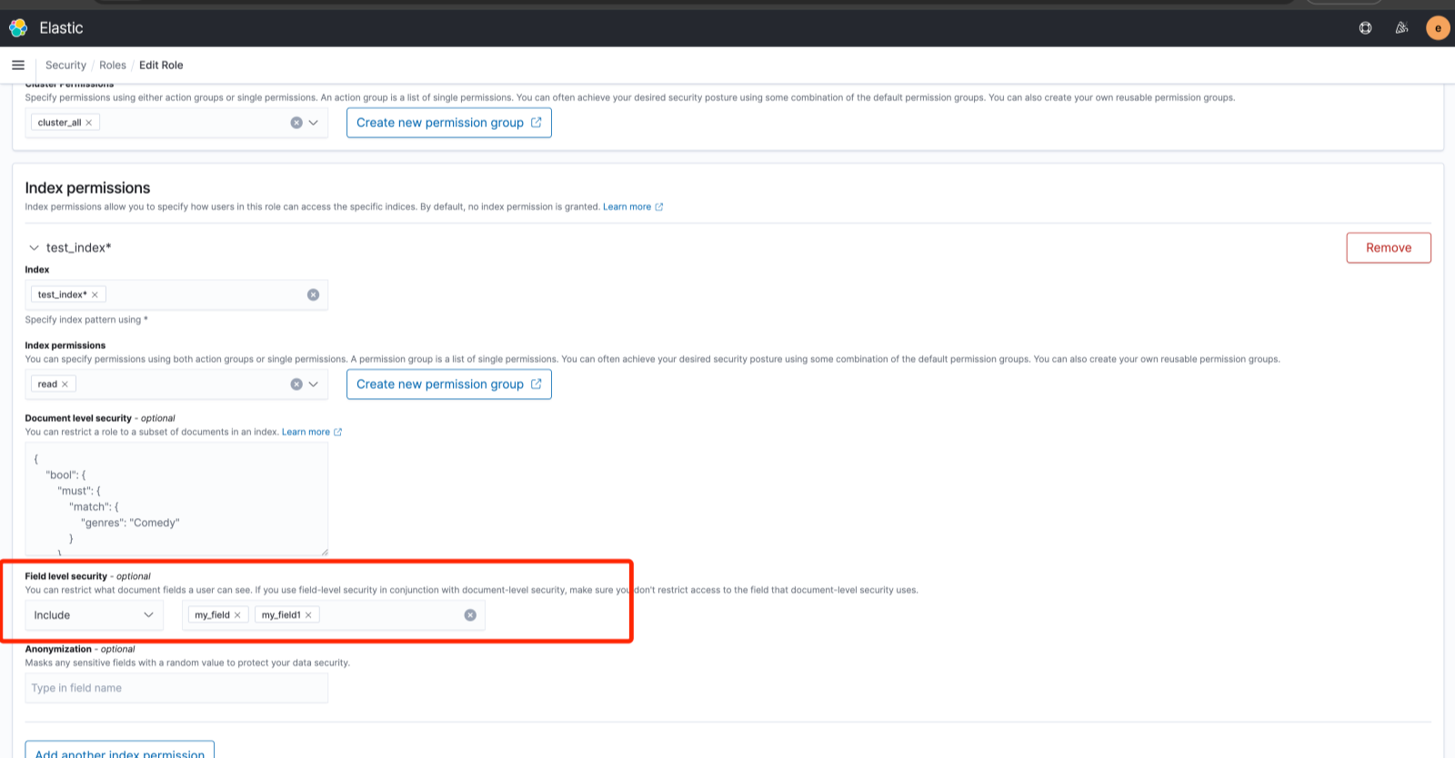 若要为该角色设置索引中字段的权限, 可以在Field Level Security中填写允许的字段。