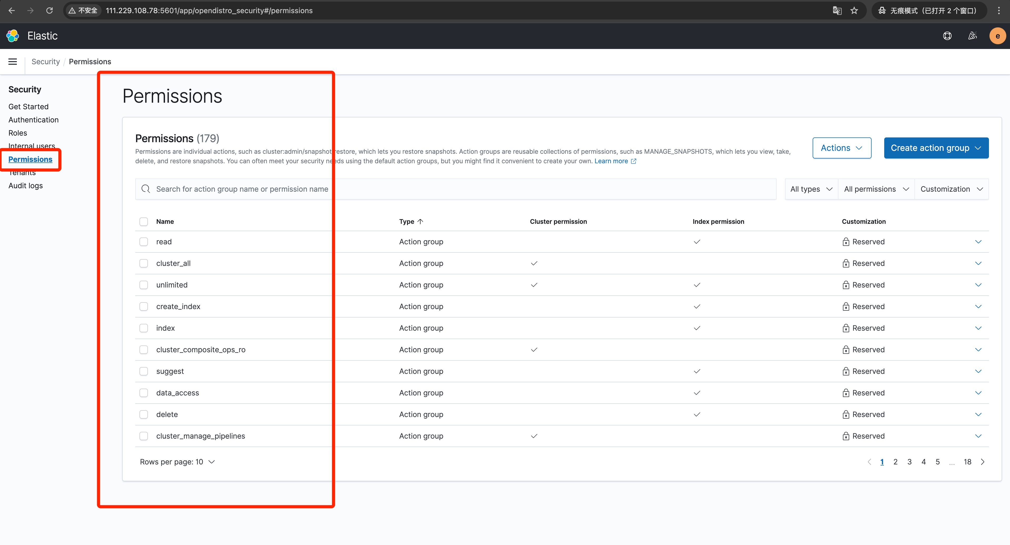 Permissions页面已经配置了各种各样的权限了, 基本可以满足大部分需求了, 不过若是还想创建权限组, 可以单击下图右上角创建新的权限。