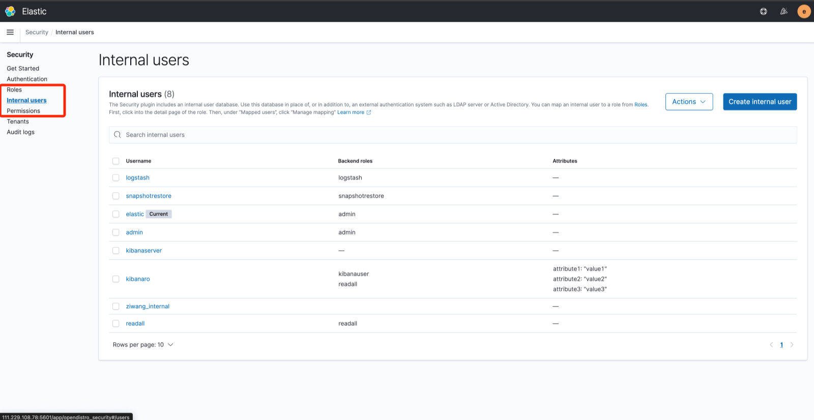 - 单击Internal Users可以创建新的用户,并且可以对用户的权限进行配置, 单击 Roles 可以对角色的权限进行配置,单击Permissions可以对权限进行配置。