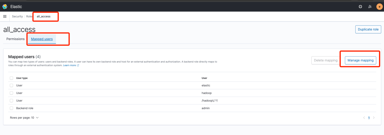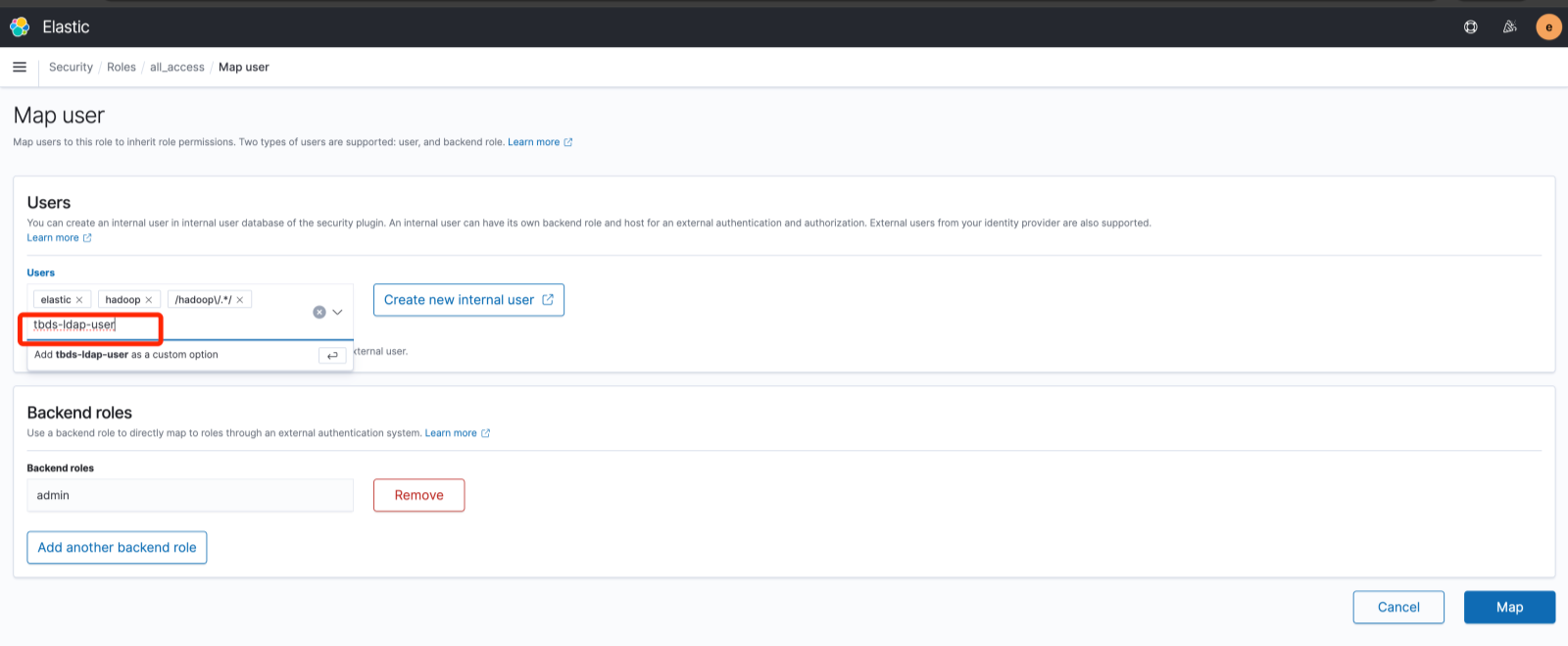 选择internal_users中的用户名或者 TBDS 中的用户名, 单击右下角的Map键, 即可为用户赋予这个角色的权限。