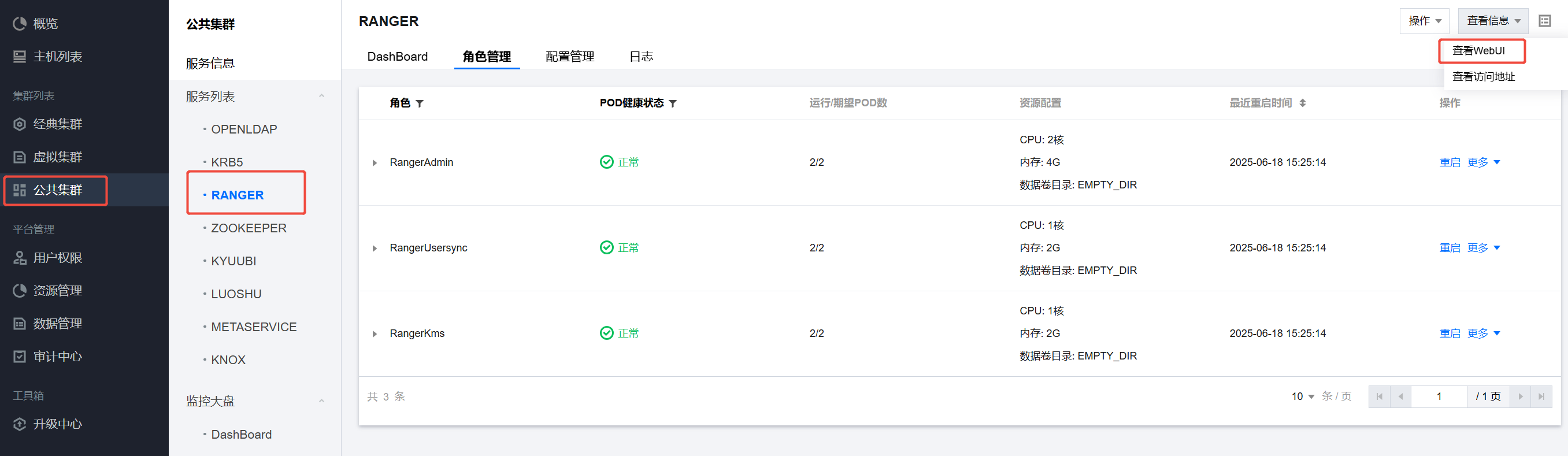 通过TBDS Manager的集群管理页面,进入公共集群找到对应的ranger服务,并访问WebUI的地址。