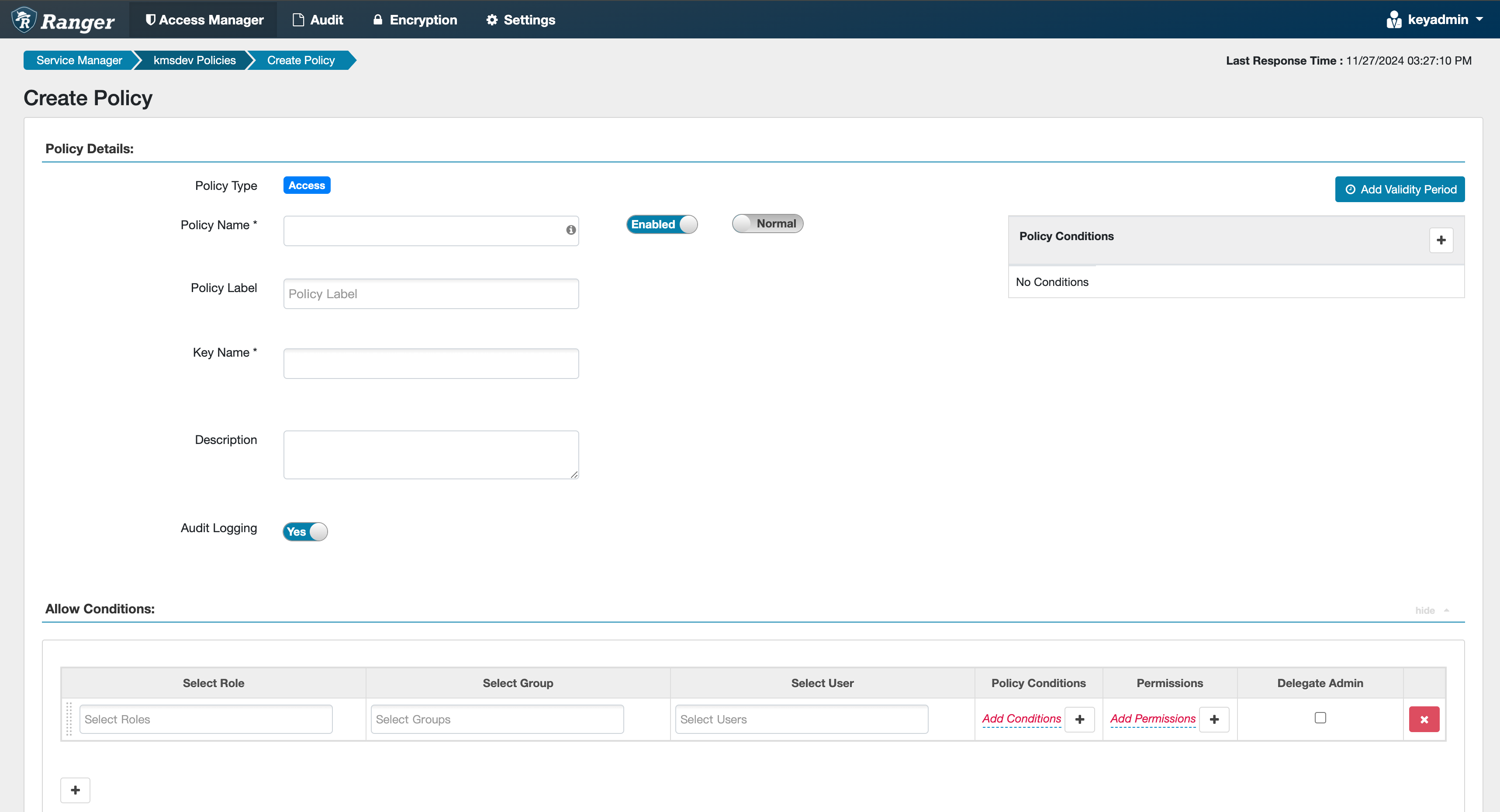 | Allow Conditions | 允许策略,可以对选择的用户、用户组或者角色配置相应的权限。包括: Create:创建Key Delete:删除key Rollover:更新key Set Key Material:设置密钥密文 Get:读取某个key Get keys:读取所有key (策略中配置的key) Get Metadata:获取key的元信息 Generate EEK:生成EEK Decrypt EEK:解密EEK Exclude from Allow Conditions:配置允许条件之外的例外规则。 |