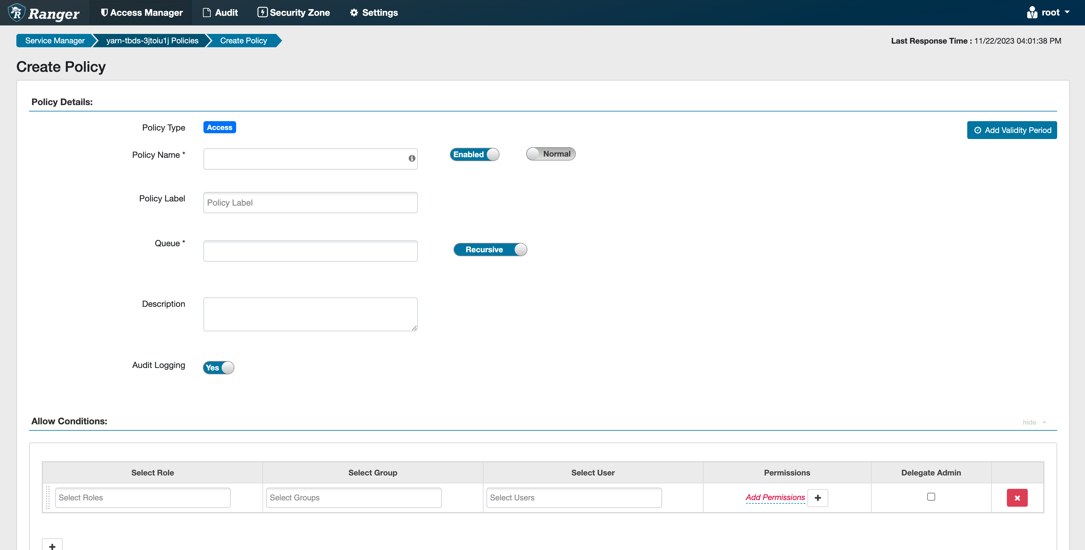 | Queue | YARN资源队列,可填写多个值,支持通配符"*" 并且可以设置是否递归,如果开启,则同时子队列也配置该策略 non-recursive: 关闭递归 recursive: 开启递归 |