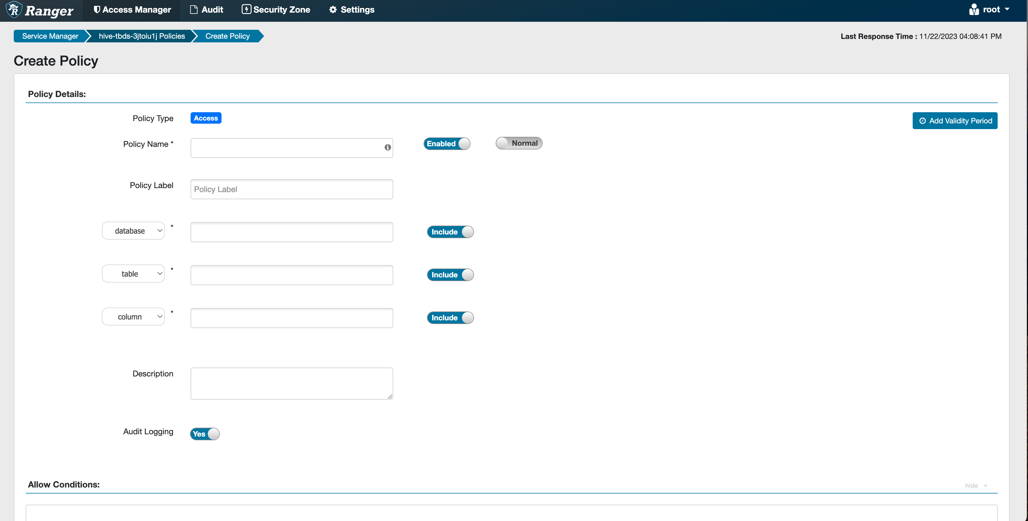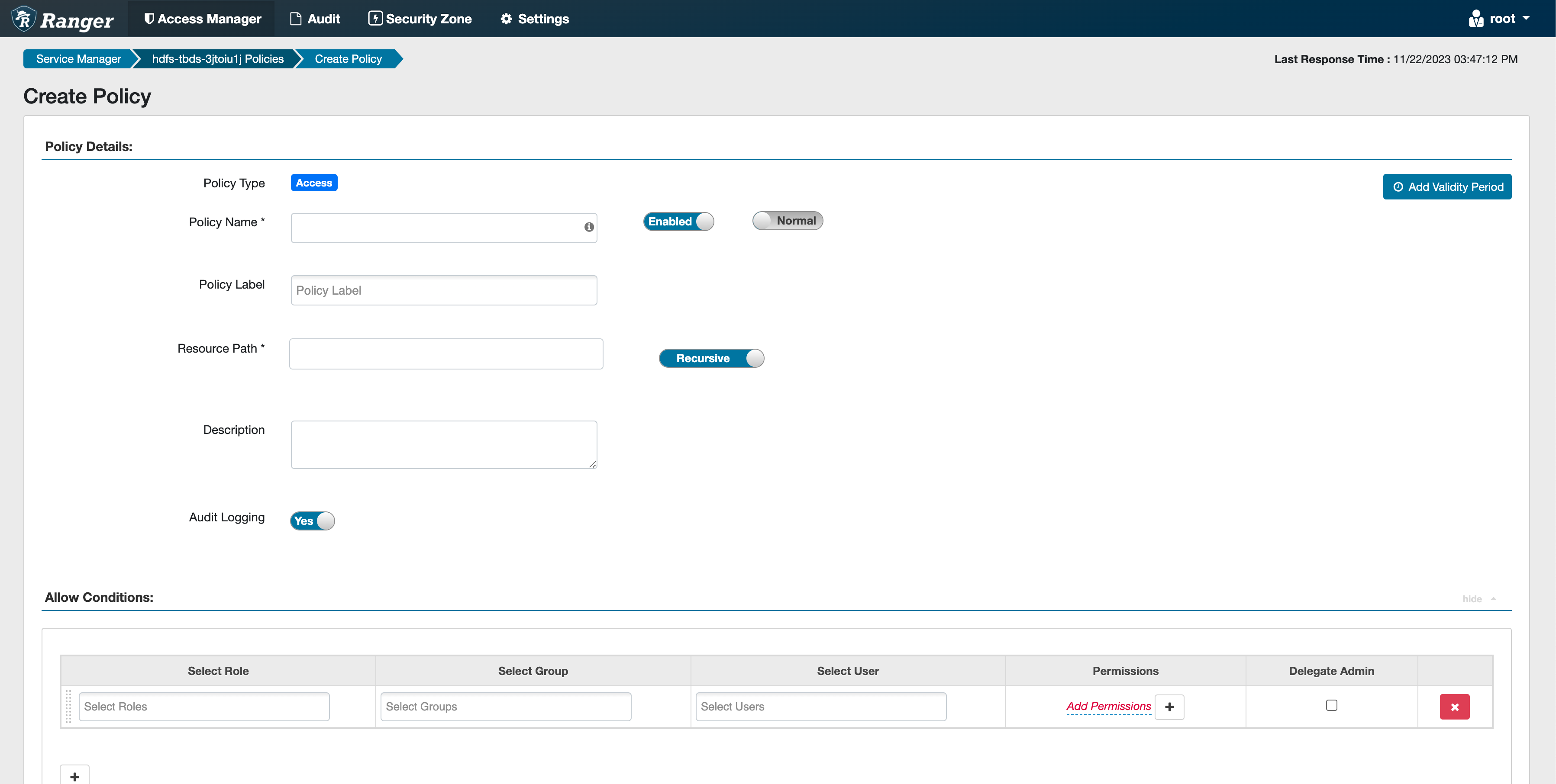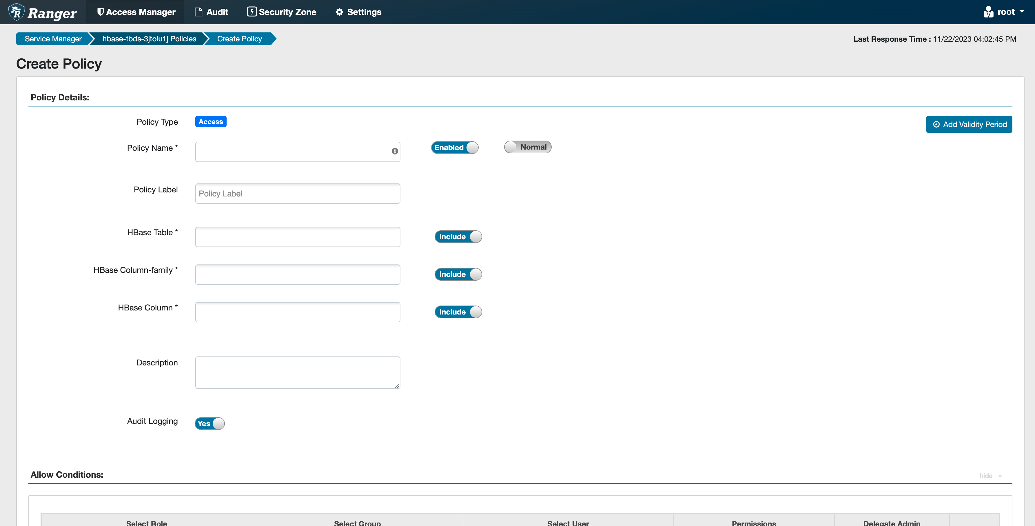 | Allow Conditions | 策略允许条件设置,并通过"+"号进行添加 Select Role: 授予的角色 Select Group: 授予的用户组 Select User: 授予的用户 Permission: 授权策略 Read(读权限)、Write(写权限)、Execute(执行权限)、Select/Deselect All(全选/取消全选) Delegate Admin: 是否让这些用户或用户组能够管理该条策略 Exclude from Allow Conditions:配置排除在允许条件之外的例外规则。 |