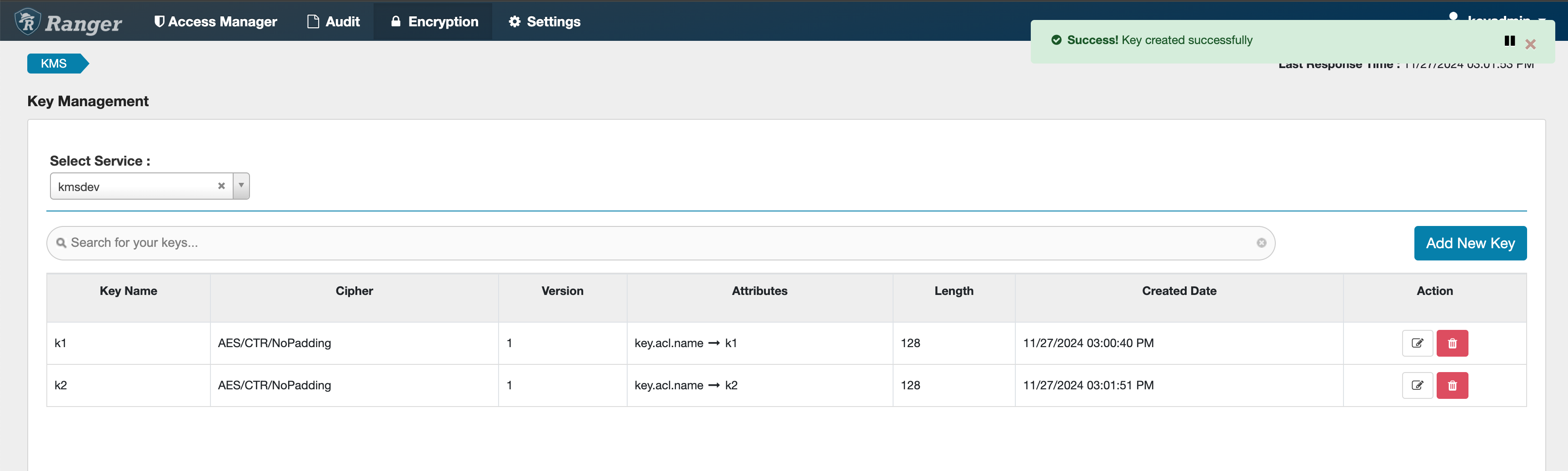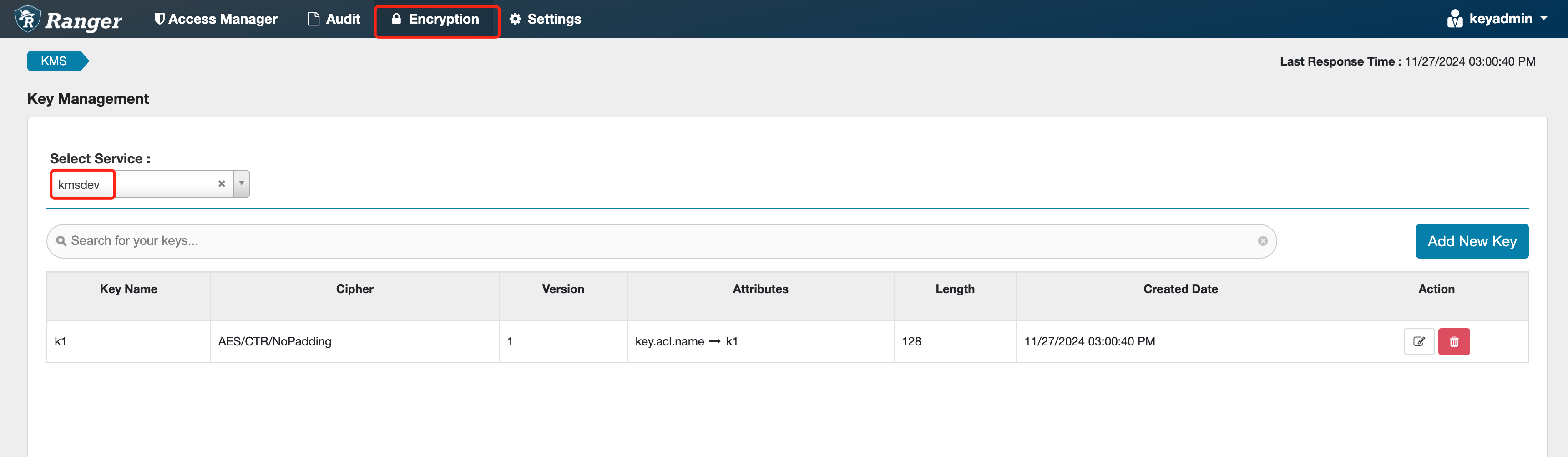 点击Encryption按钮,选择kmsdev服务,可以查看当前密钥列表。