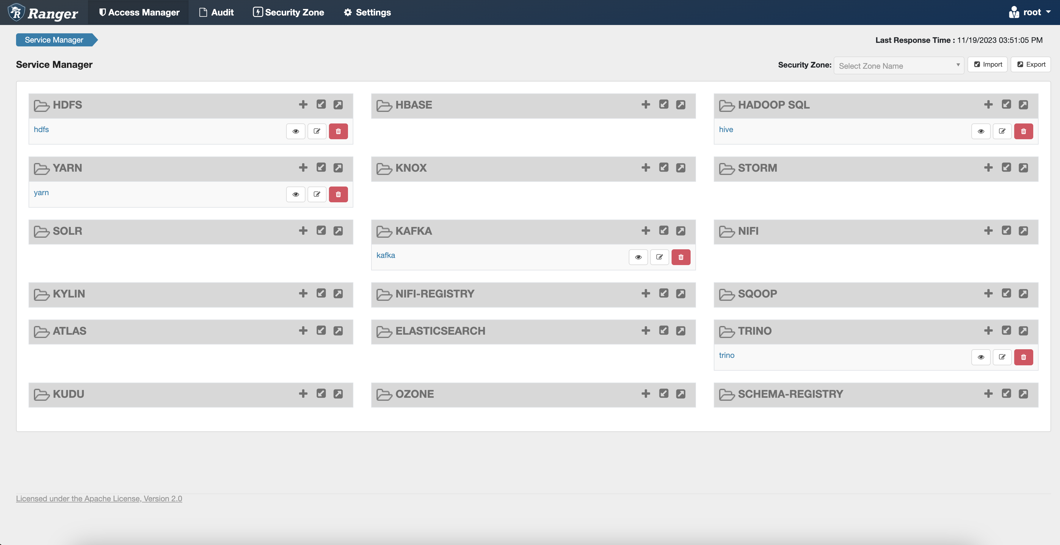 登录后在Ranger首页的“Service Manager”区域内,单击组件名称下的权限插件名称,即可进入组件安全访问策略列表页面。