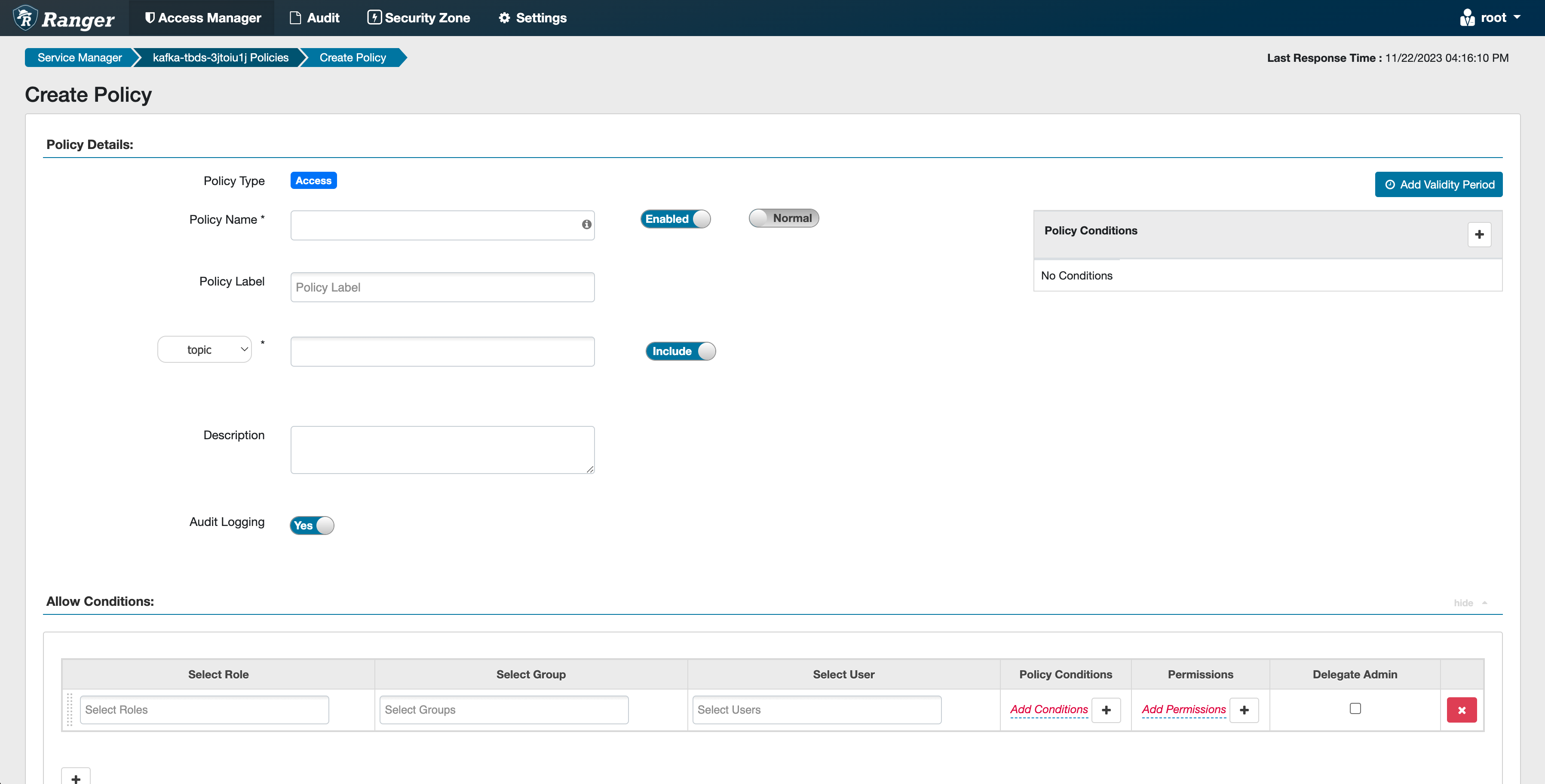 | Allow Conditions | 策略允许条件设置,并通过"+"号进行添加 Select Role: 授予的角色 Select Group: 授予的用户组 Select User: 授予的用户 Permission: 授权策略 Publish(生产权限)、Consume(消费权限)、Describe(查询权限)、Create(创建主题权限)、Delete(删除主题权限)、Describe Configs(查询配置权限)、Alter(修改topic的权限)、Alter Configs(修改配置权限)、Select/Deselect All(全选/取消全选) Delegate Admin: 是否让这些用户或用户组能够管理该条策略 Exclude from Allow Conditions:配置排除在允许条件之外的例外规则。 |