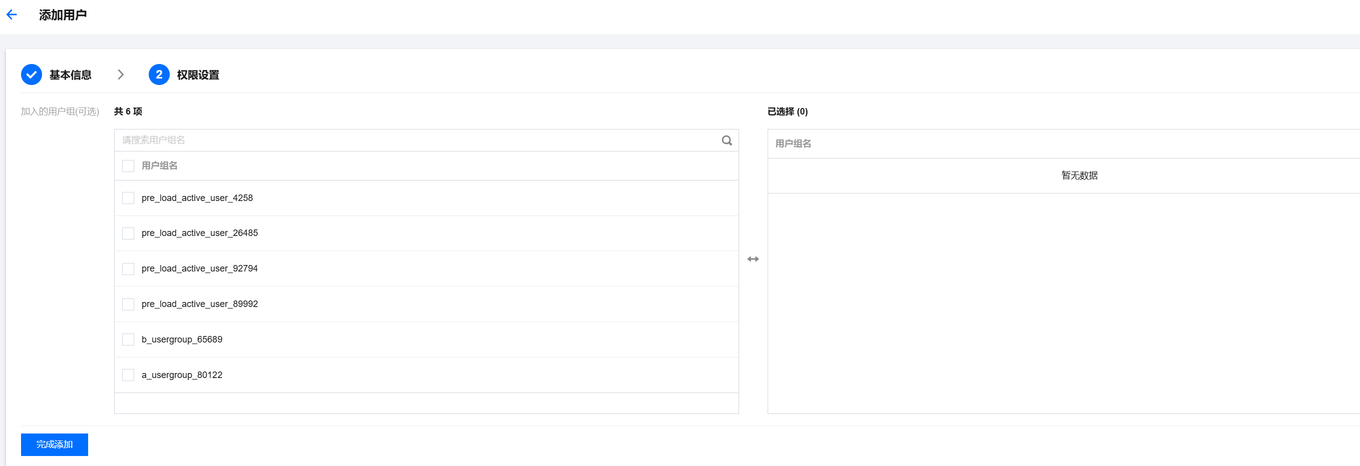- 经过步骤 2 或 3 后已经完成用户创建,点击下一步进入权限配置页面进行用户组设置。