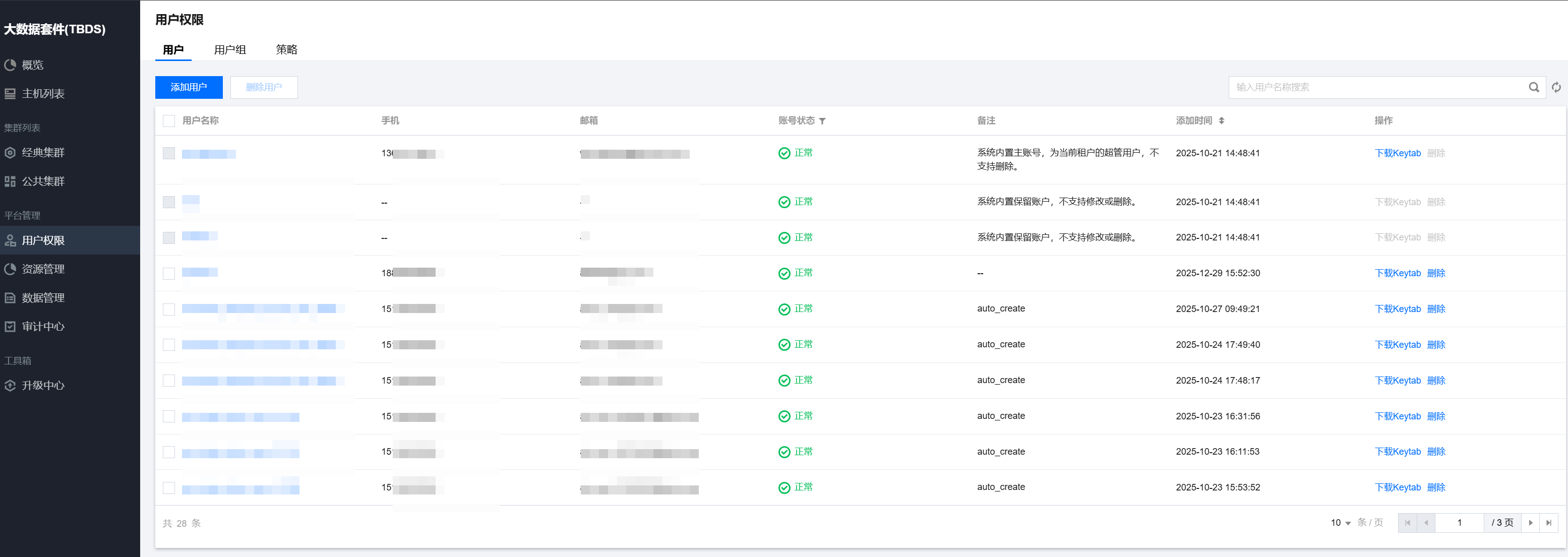- 以租户管理员或系统管理员身份登录TBDS Manager,点击左侧“用户权限”菜单进入列表页面。