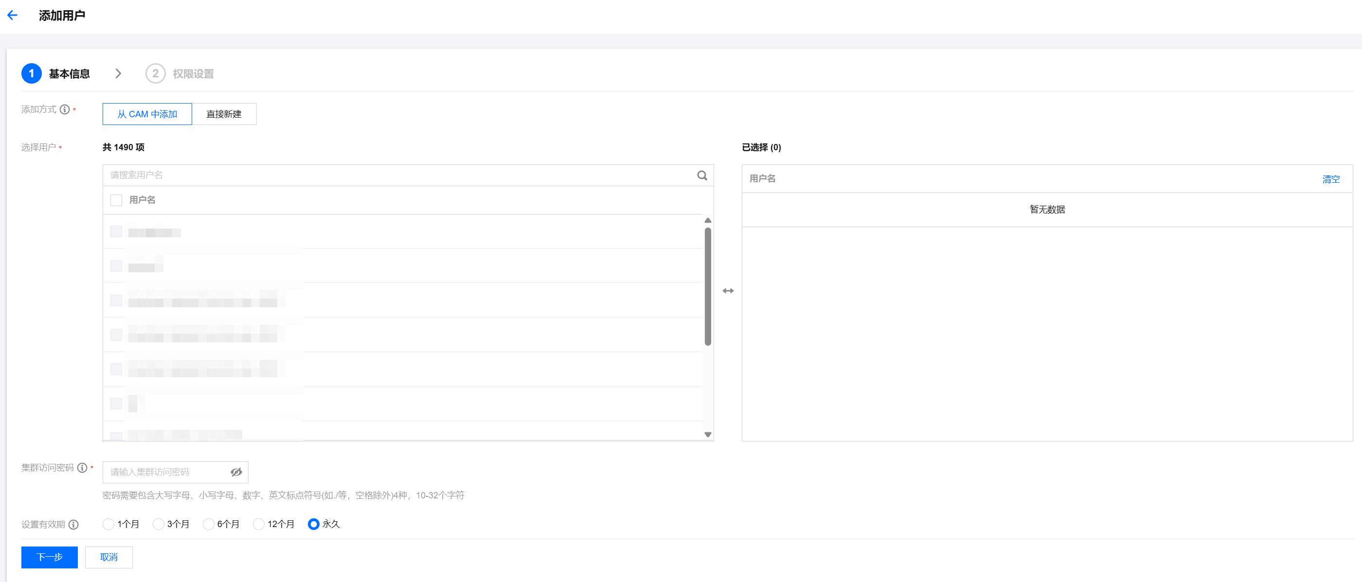 - 点击“添加用户”,选择“从 CAM 中添加”,搜索需要添加的用户,并输入集群访问密码(说明此密码是访问大数据平台组件的密码,可能和登录密码不一样),点击下一步。