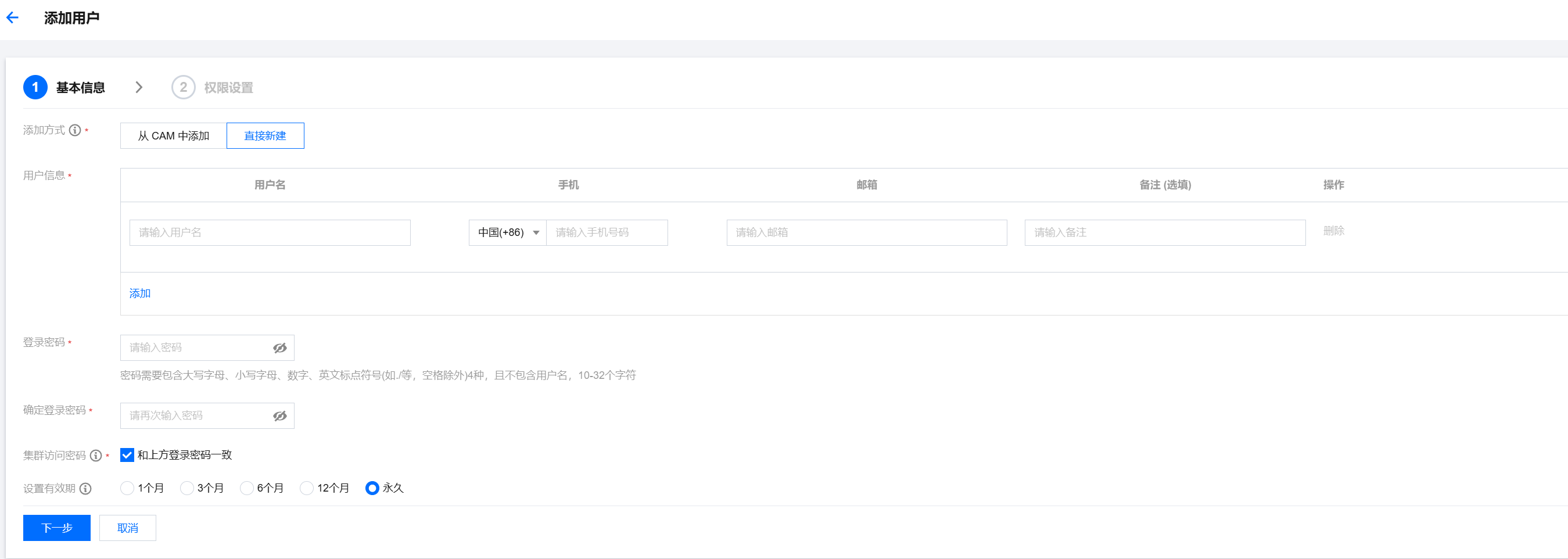 - 如果上一步没有想要的用户,可以点击“直接新建”添加方式,输入登录密码,注意默认情况下TBDS Manager 登录密码和集群访问密码相同,如果希望不同,可取消“和上方登录密码一致”勾选单独输入,完成后点击下一步。