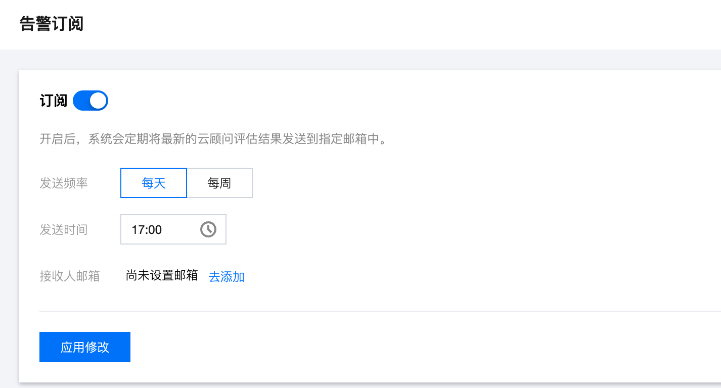 云顾问支持用户通过告警订阅功能,将评估结果发送至指定邮箱。本文介绍如何通过云顾问控制台进行订阅。
