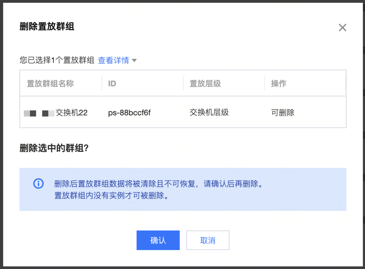 - 单击待删除置放群组操作列【删除】,在对话框中单击【确认】删除完成。