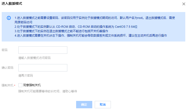 - 在弹出的进入救援模式页面中,输入实例的登录密码并确认密码,单击确定。