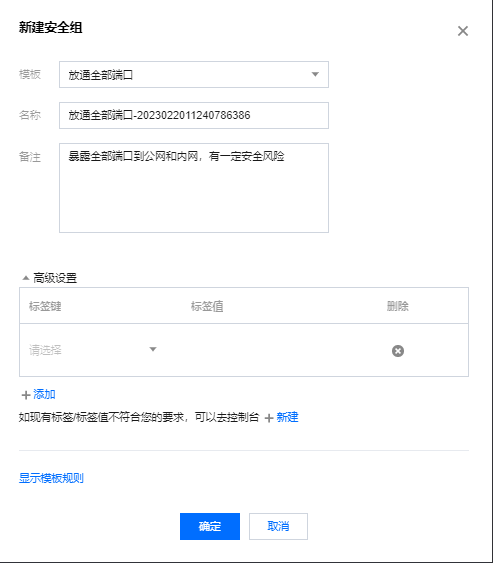 放通全部端口 默认放通全部端口到公网和内网,具有一定安全风险。 -