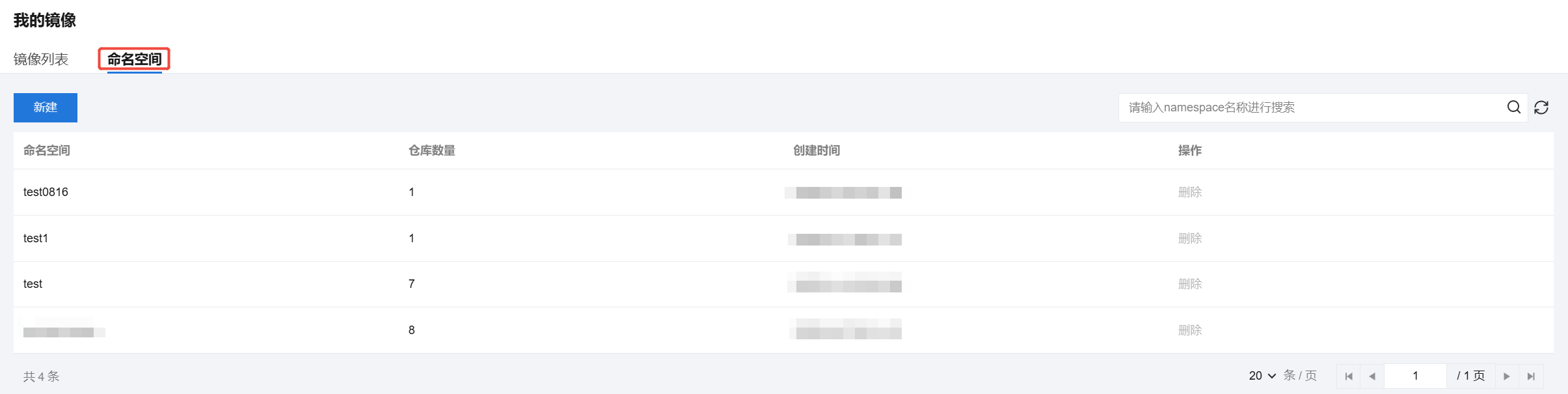 2. 在“我的镜像”页面中,选择【命名空间】页签并单击【新建】。