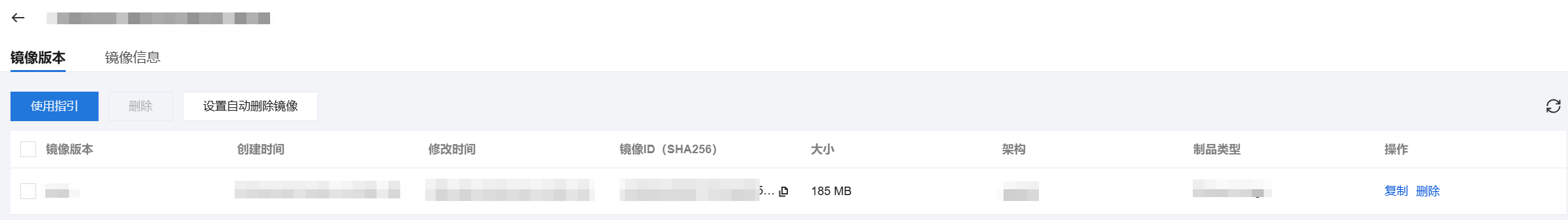 说明:如果需要删除镜像的某个版本,可以通过单击镜像名称,进入“镜像版本”页面后,根据需要选择对应镜像版本进行删除操作。