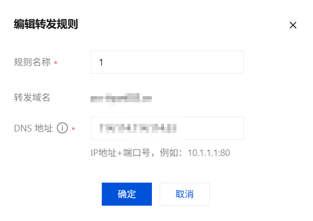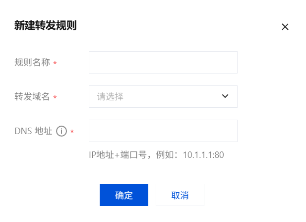 单击新建转发规则,在弹框中设置规则名称、转发域名及对应DNS地址。