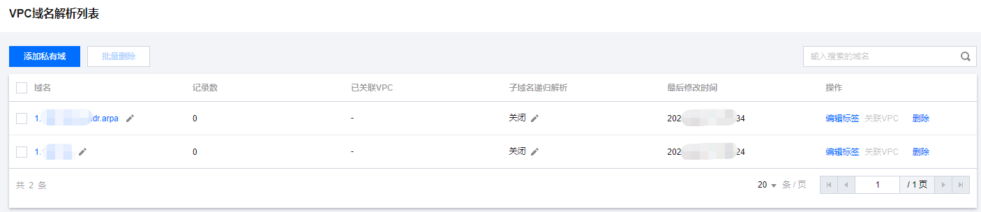 登录 VPCDNS 控制台,进入 “VPC域名解析列表” 管理页面。