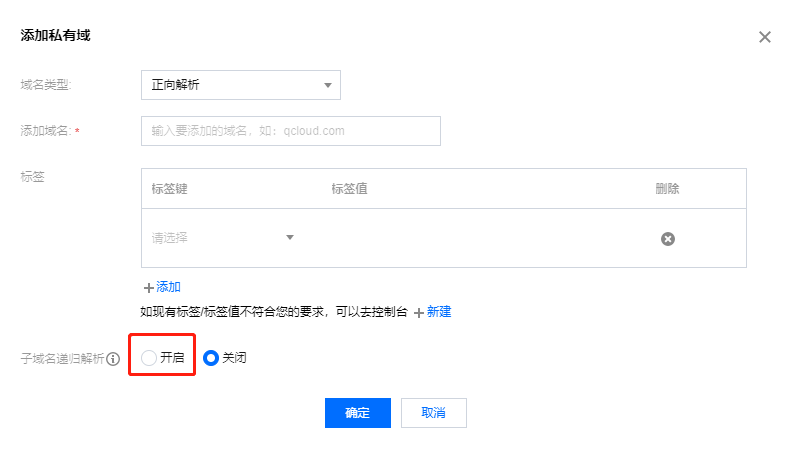 您可以在首次添加私有域时,选择开启子域名递归解析。具体操作请参见 创建私有域。