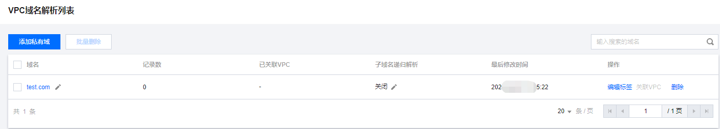 登录 VPCDNS 控制台,进入 “VPC域名解析列表” 管理页面。