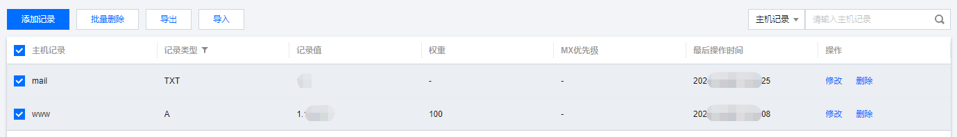 - 如您要删除多个解析记录,您可以勾选多个记录,单击批量删除按钮进行删除。