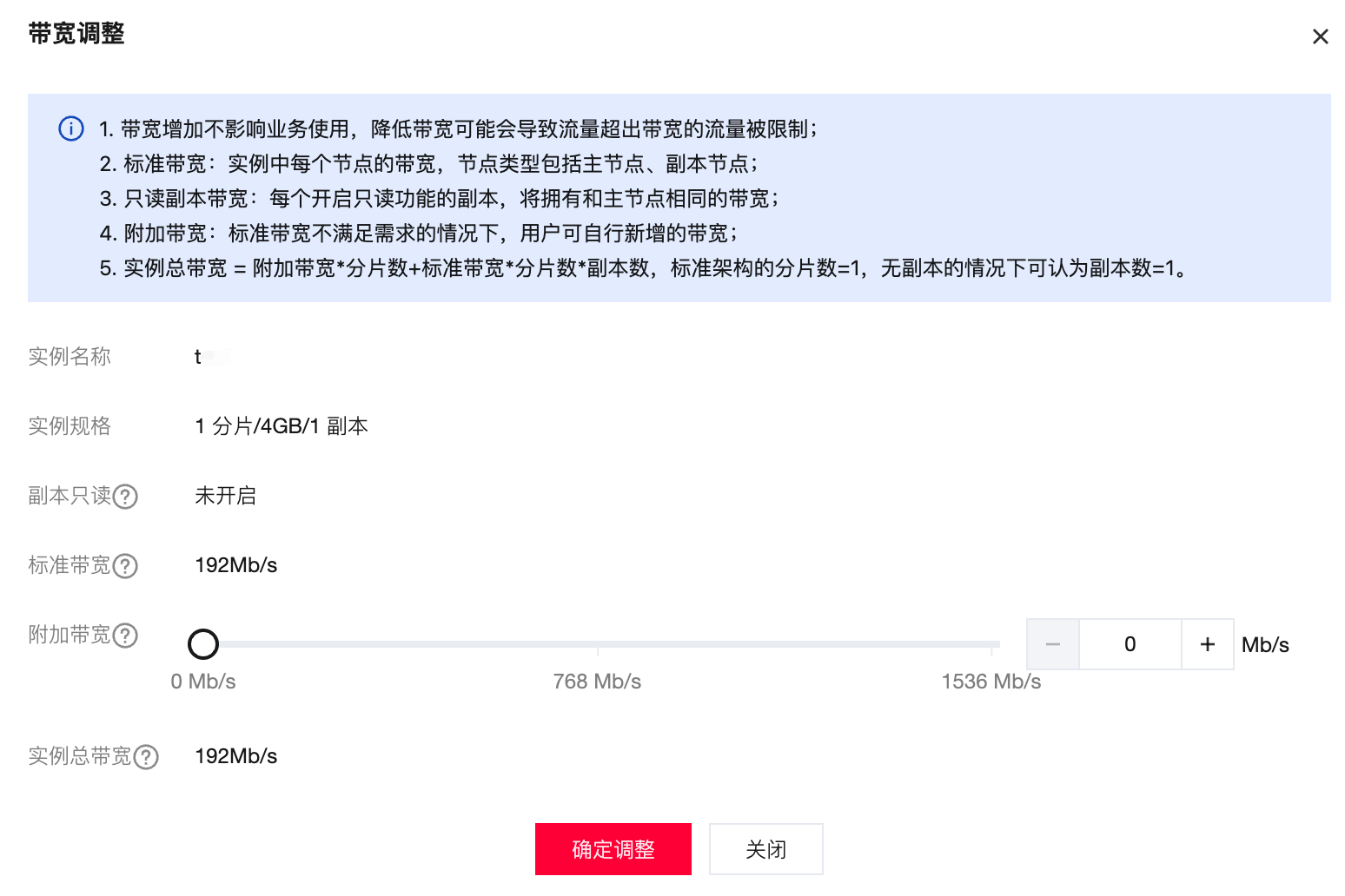 标准带宽 当前实例每个节点的带宽,节点类型包括主节点、副本节点。