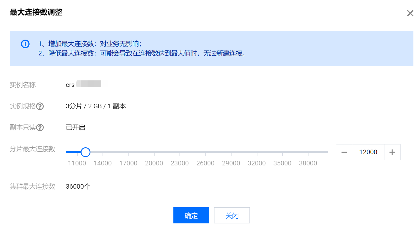 参数名称 参数解释 实例名称 实例的名称信息。 实例规格 实例的配置规格信息,包括:分片数量/分片容量/副本数量。 副本只读 副本只读是否开启,即是否开启读写分离。 分片最大连接数 在滑轴上调整每个分片的最大连接数。 集群最大连接数 自动计算整个实例的最大连接数,即每个分片的最大连接数 x 分片数量。
