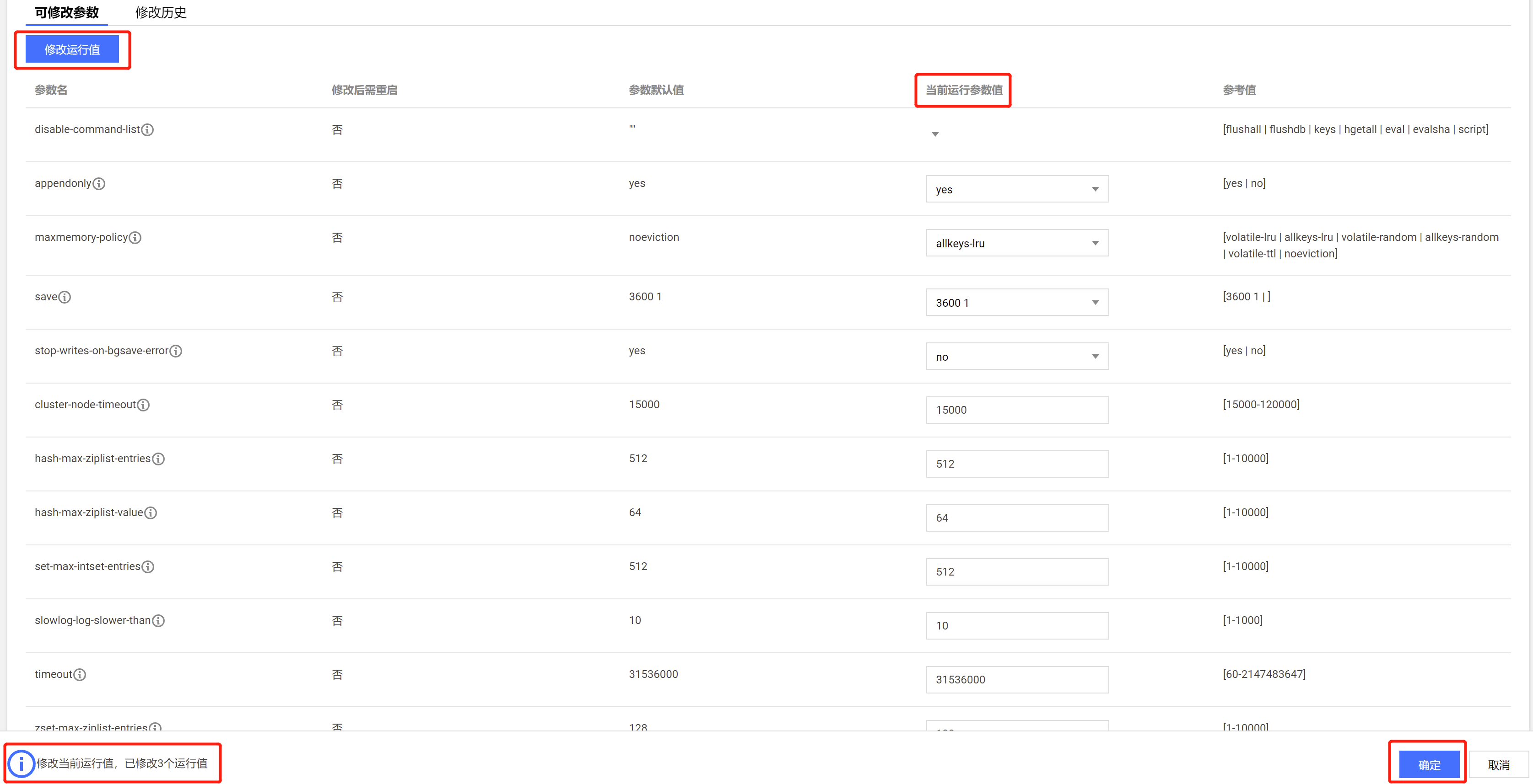 - 在【当前参数运行值】列,选择需要修改的所有参数进行修改,确认修改无误后,单击【确定】,参数将被修改。