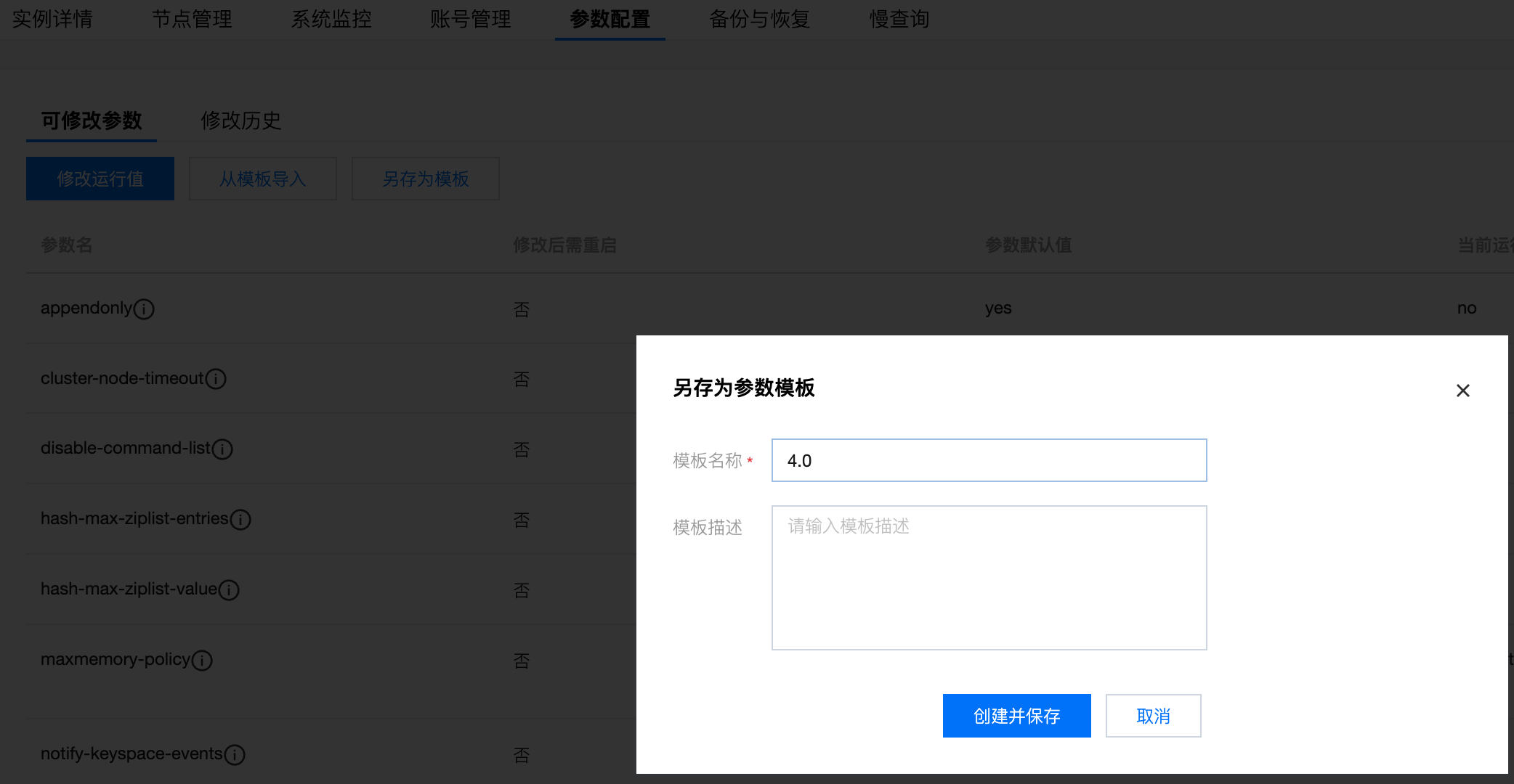 另存为模板,可以将当前实例现有的参数,指定为一固定的模板,便于其他实例应用该实例的参数。