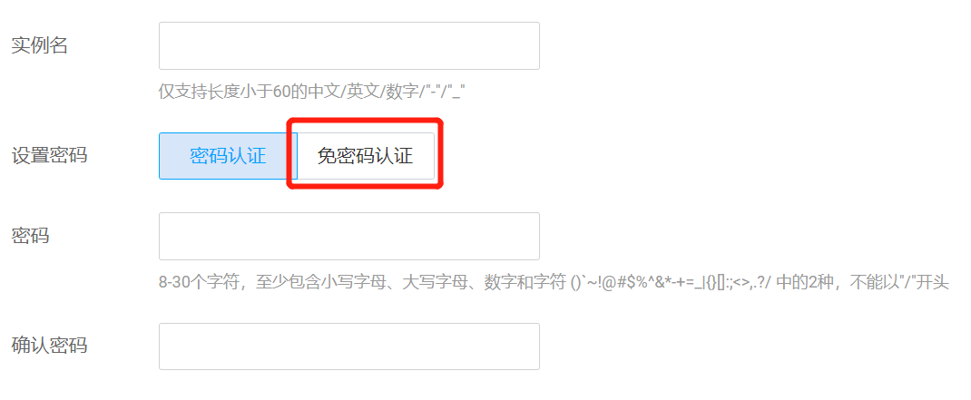 - 在购买页的设置密码选项中,选择免密码认证,实例创建成功后无需密码认证即可访问。