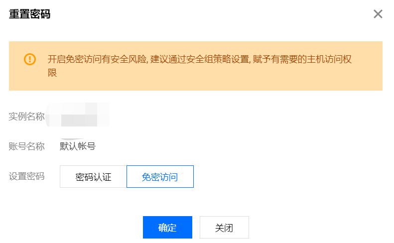 - 为保障数据安全,不建议开通免密码访问。