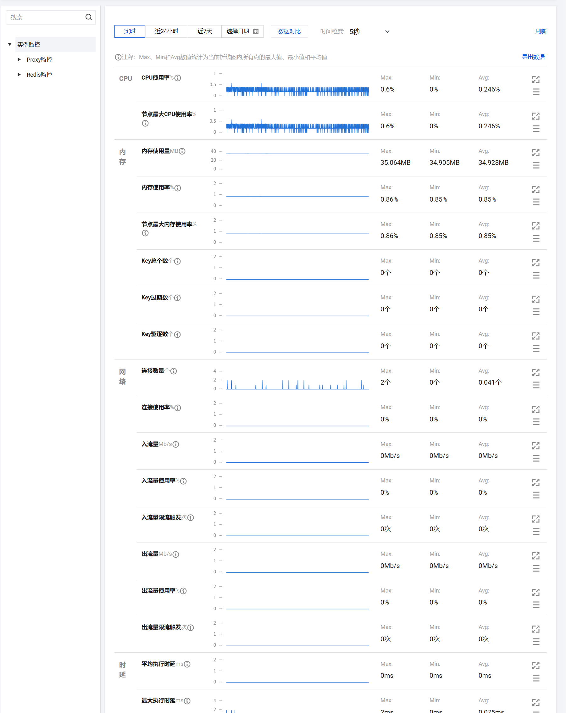 - 在【监控指标】页签下方,在左侧导航栏,可以直接选择实例监控、Proxy 监控、 Redis监控,查看一个维度所有的监控指标视图,如下图所示。在日期的下拉框,指定查询的时间段,在【时间粒度】后面的下拉列表,您可以选择数据采集粒度,查看不同时间精度的监控数据与图形变化。