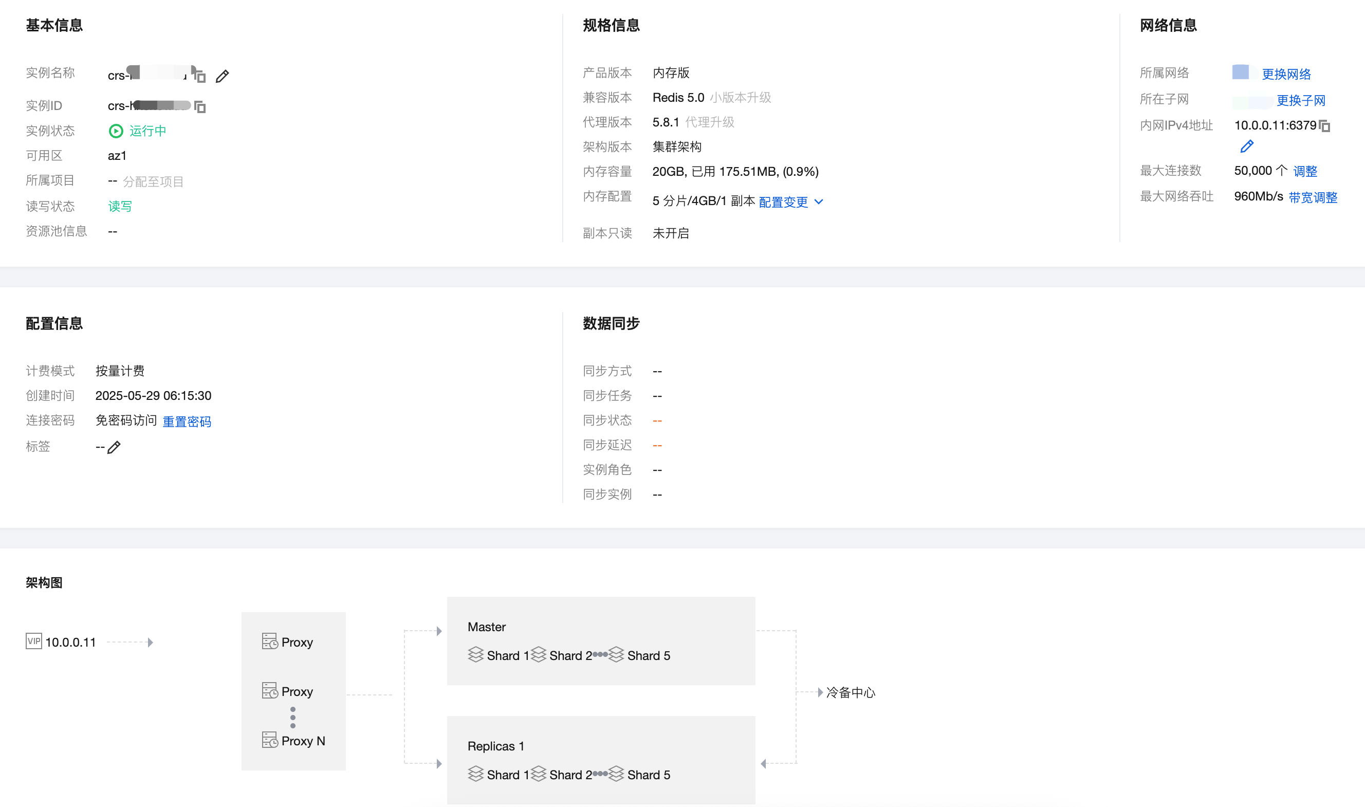 最大连接数 数据库当前限制的最大客户端连接数量。单击<strong>调整</strong>,可调整访问连接数。具体操作,请参见 调整连接数数量。 最大网络吞吐 数据库访问的最大网络吞吐,入流量限流与出流量限流触发的条件。单击<strong>带宽调整</strong>,可增加附加带宽。具体操作,请参见 带宽调整。 <strong>配置信息</strong> 计费模式 实例的计费模式:按量计费 创建时间 创建实例的时间。 连接密码 连接数据库时需要配置的密码。单击<strong>重置密码</strong>,可重新设置密码,也可设置免密访问。具体操作,请参见 重置密码。 标签 实例所关联的标签。可修改标签,具体操作,请参见 编辑实例标签。 <strong>数据同步</strong> 同步方式 该实例正在进行数据同步的方式,例如 DTS。 同步任务 同步任务 ID 编号。 同步状态 任务执行的状态。 同步延迟 同步延迟数据的字节数。 实例角色 同步数据该实例角色,标识为源实例还是目标实例。 同步实例 同步实例的对端实例 ID 及其名称。 <strong>架构图</strong> 数据库实例部署的架构图。 - 单击
