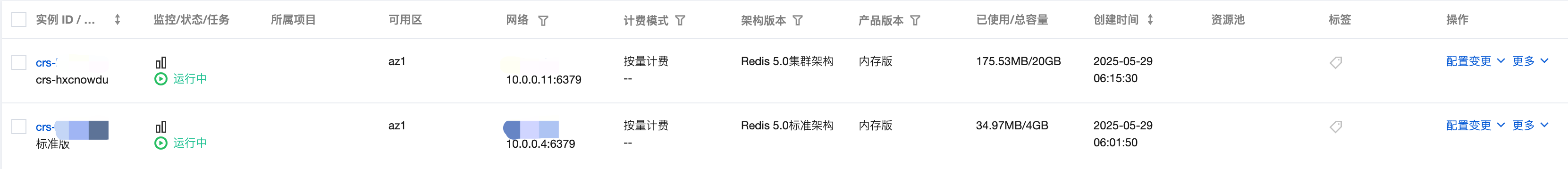 通过客户端工具连接数据库或者通过SDK连接数据库,均需要配置实例的IP地址。具体操作,请参见连接数据库。计费模式 仅支持【按量计费】。 架构版本 实例兼容redis的版本信息。包括:4.0标准架构、4.0集群架构、5.0标准架构、5.0集群架构、6.2标准架构、6.2集群架构。 产品版本 产品类型,仅支持【内存版】。 已使用/总容量 实例已使用的容量大小以及总容量大小。当容量不足,可及时进行扩容。具体操作,请参见变更实例规格。 创建时间 创建实例的日期及时间点。 操作 在操作列,可以对实例进行如下操作。