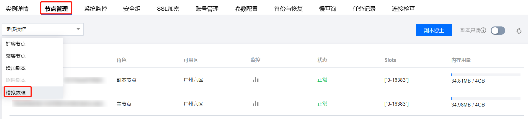 - 在实例详情页面,单击节点管理页签,在更多操作的下拉列表中,选择【模拟故障】。