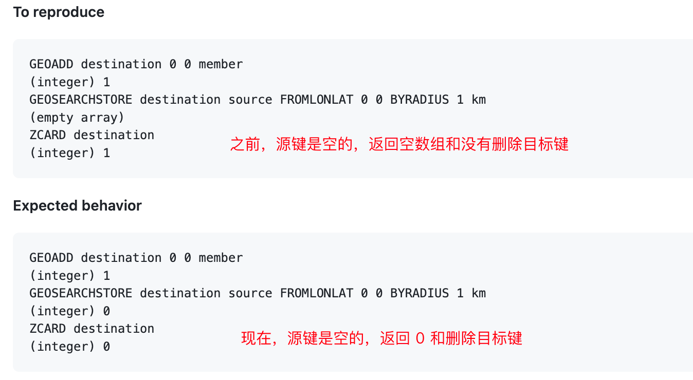 | geo* store | 在 Redis 6.2 版本中修复了以下问题:对于支持 STORE 选项的 GEO 命令(如 GEORADIUS、GEORADIUSBYMEMBER、GEOSEARCHSTORE),当源键 (source key) 为空键时,其行为由原先的“返回空数组且不删除目标键”修改为“删除目标键并返回0”。 | ![]() | |