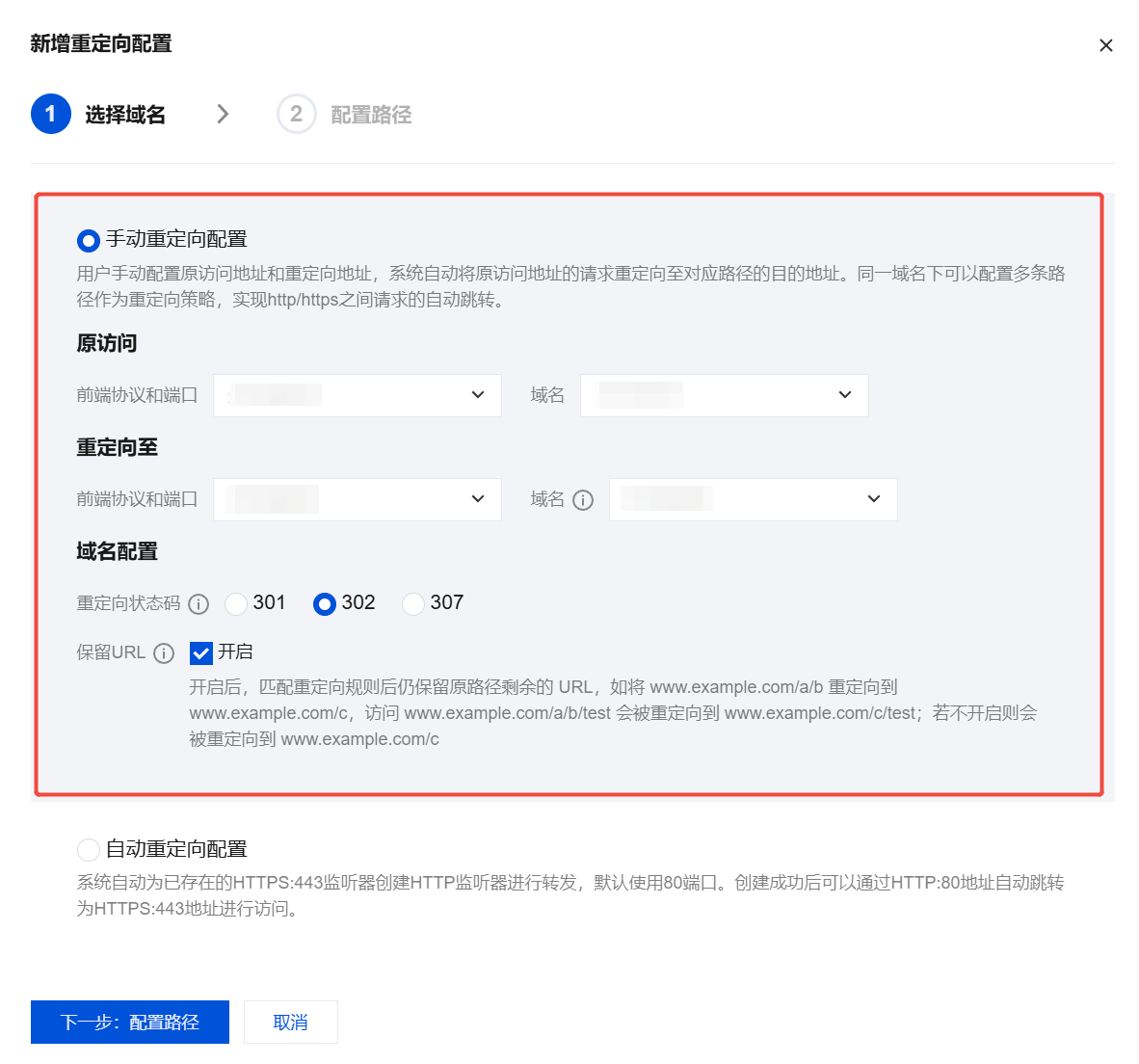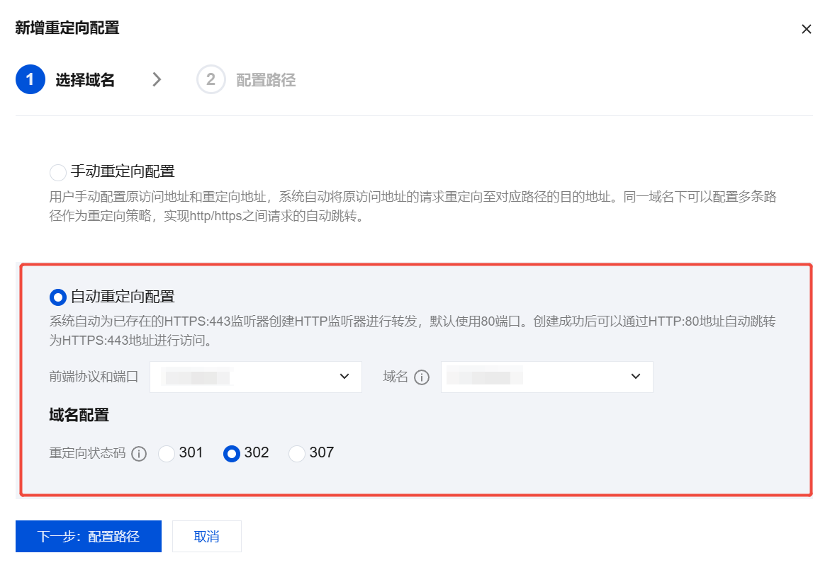 选择自动重定向配置,并选择已配置的 HTTPS 监听器和域名,在“域名配置”中选择重定向状态码,单击下一步:配置路径。