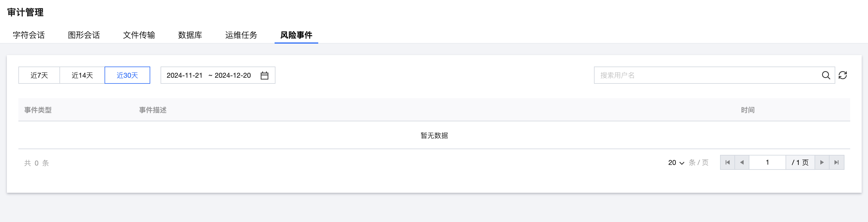步骤1:进入云堡垒机控制台之后,在左侧导航选择审计管理 > 风险事件,进入风险事件审计页面。