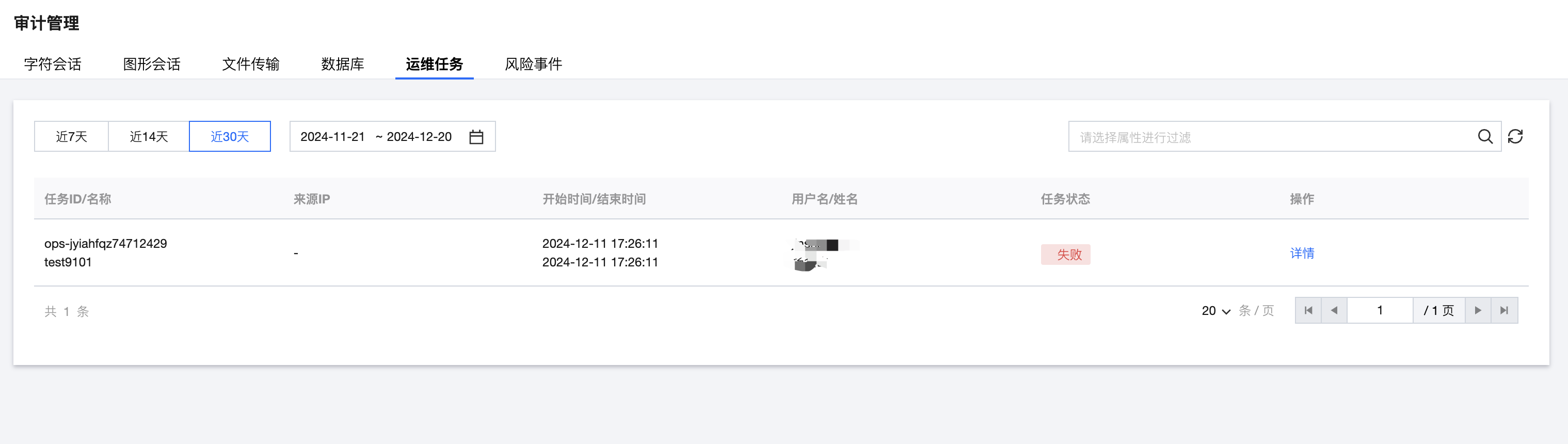 步骤1:进入云堡垒机控制台之后,在左侧导航选择审计管理 > 运维任务,进入运维任务审计页面。