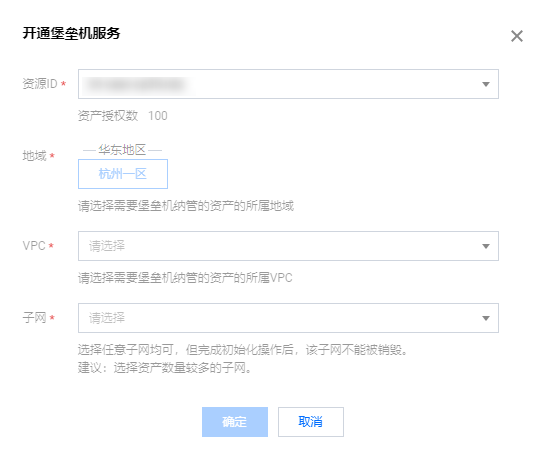 参数名称 参数说明 地域 开通堡垒机服务的地域。 VPC 开通堡垒机服务的 VPC。 子网 开通堡垒机服务的子网。 其他 页面标*的为必填项。 填写完所需内容后,单击确定,即可开通服务。