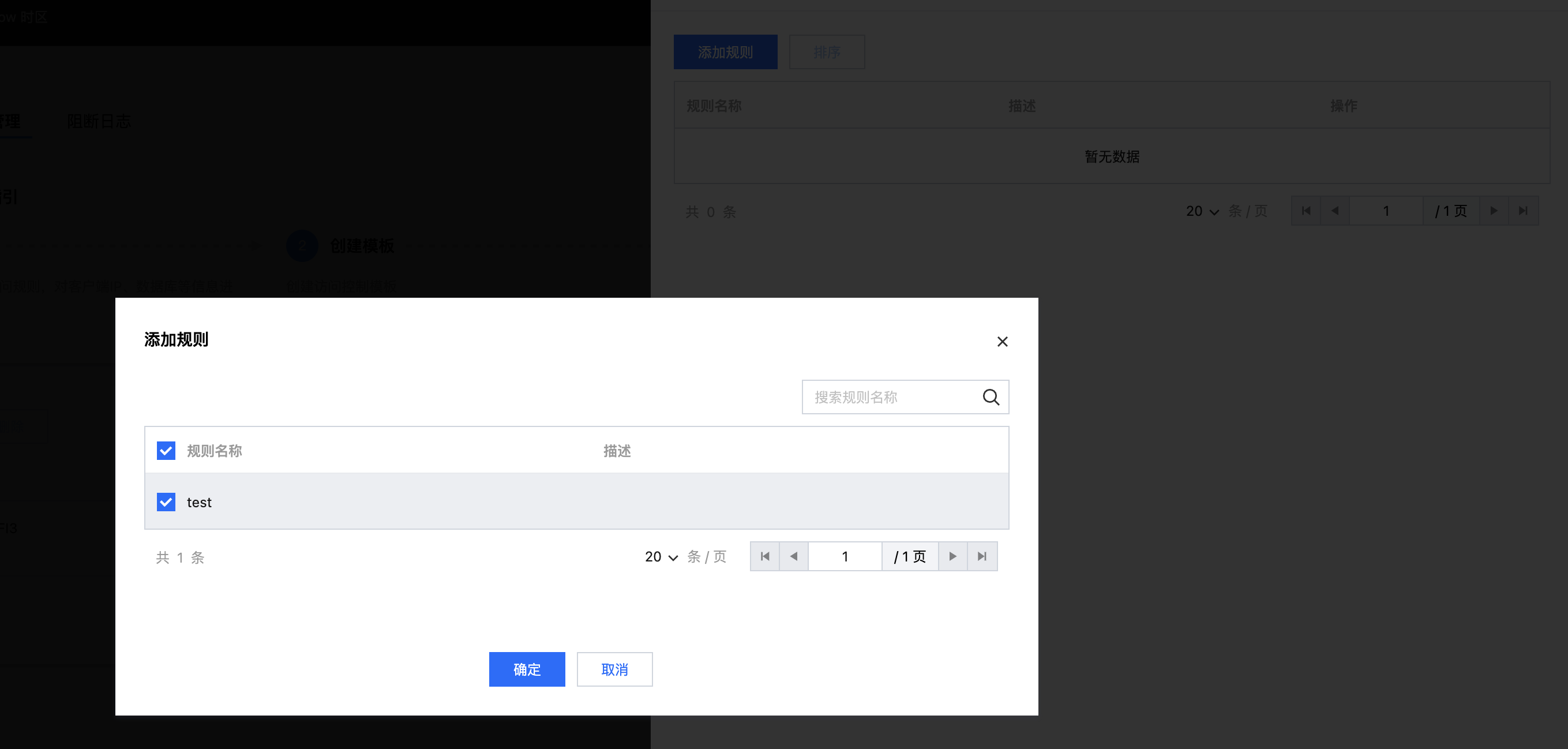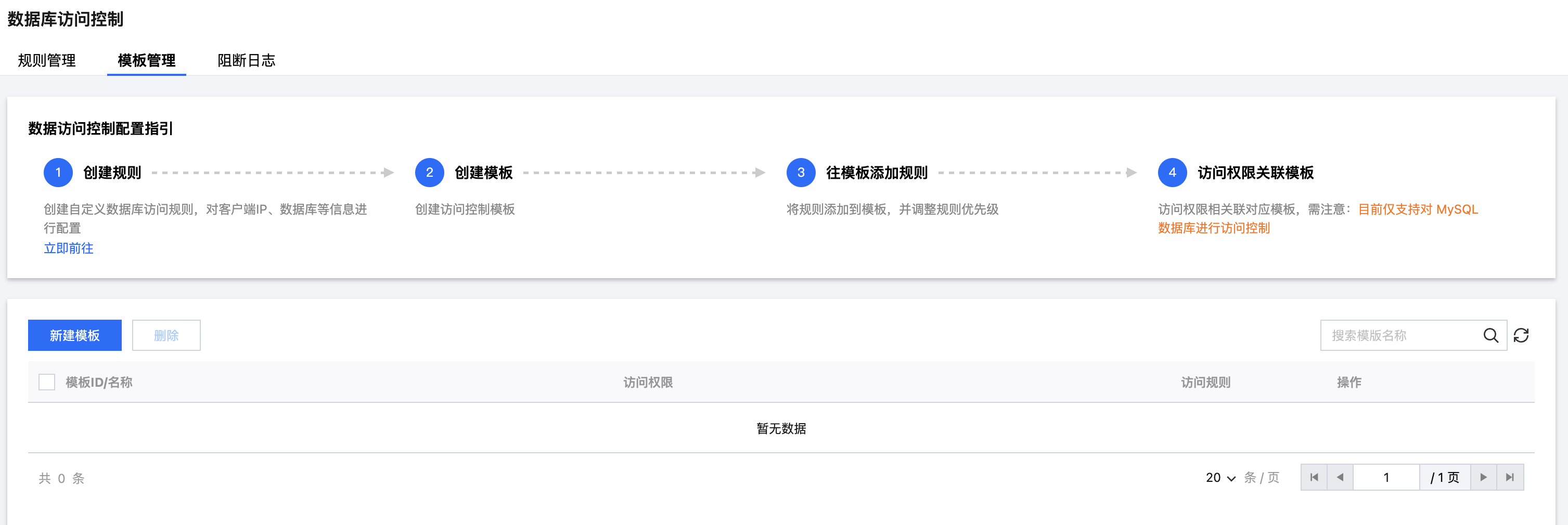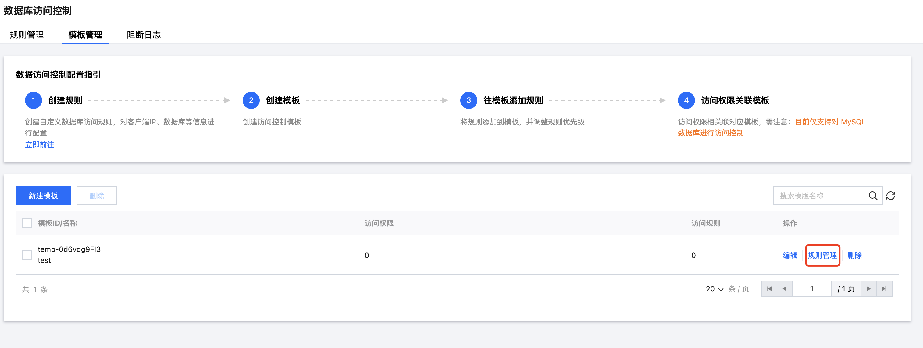 步骤1:进入云堡垒机控制台之后,在左侧导航选择数据库访问控制 > 模版管理。步骤2:点击新建模版按钮,创建模板。步骤3:点击创建的模板对应的规则管理按钮,给模板添加规则。