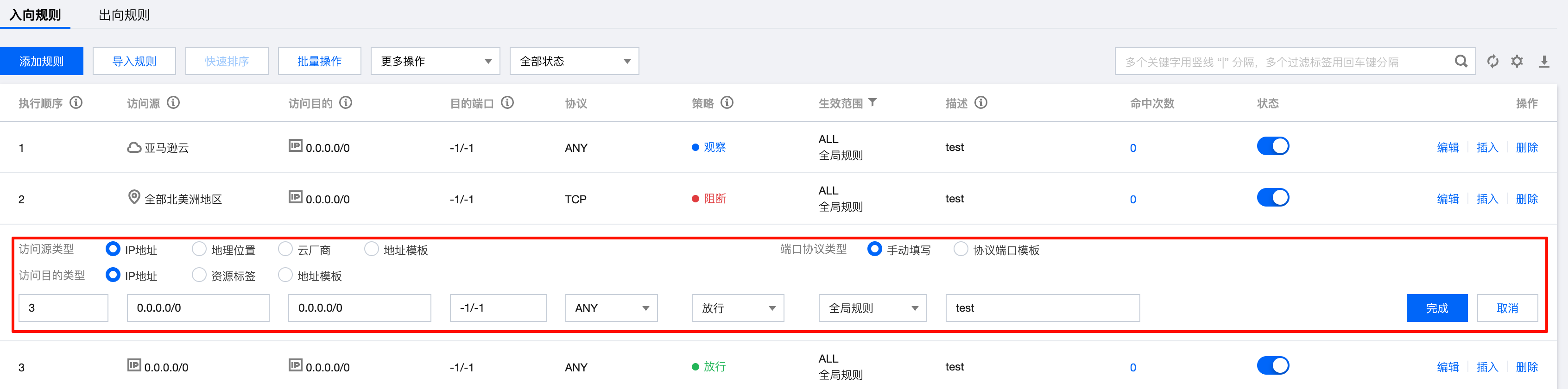 云防火墙支持在任意两条规则之间,插入一条规则,插入规则的执行顺序即为当前插入的位置。
