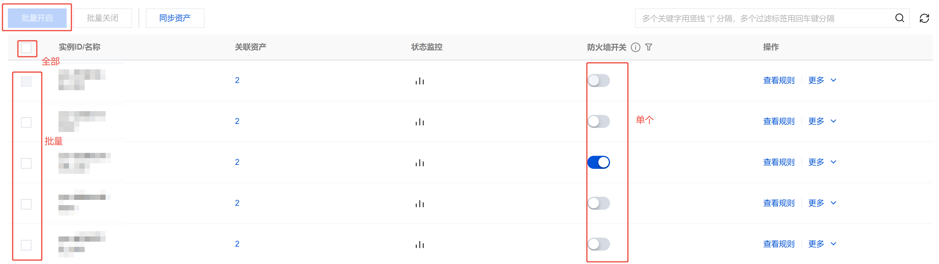 - 全部开启:勾选列表标题栏的全选复选框,然后单击页面上方的批量开启。
