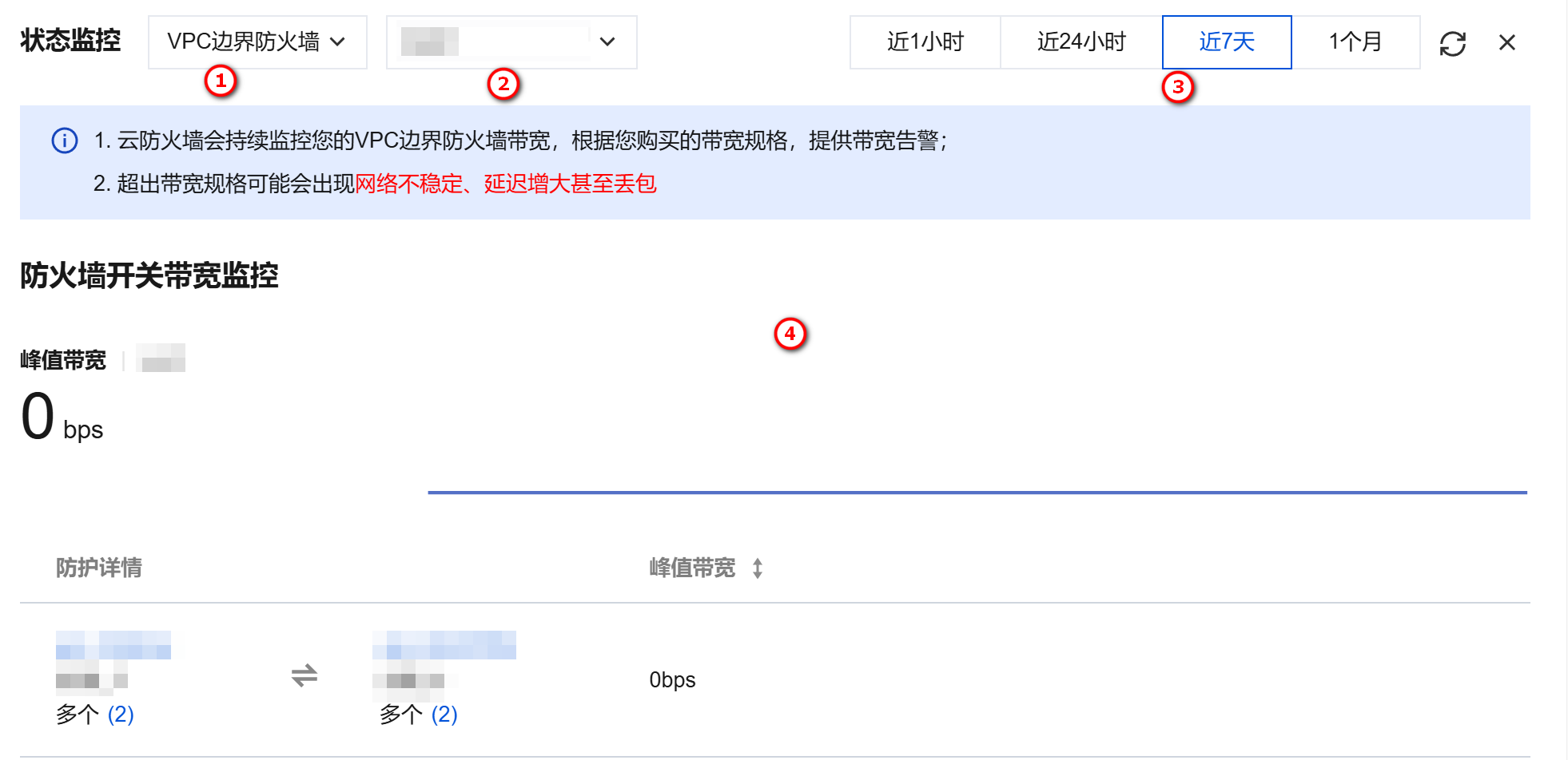 - 状态监控:①VPC 边界防火墙界面中,可以基于②对等连接实例名称对带宽监控维度进行筛选,通过选择③时间范围修改统计维度,可以看到④监控曲线。