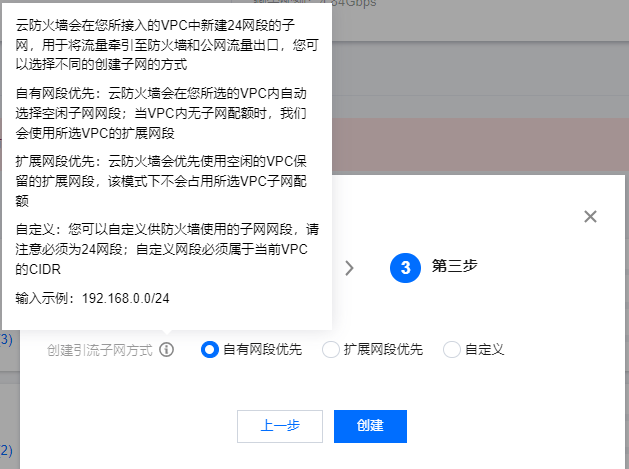 云防火墙会在您所接入的VPC中新建24网段的子网,用于将流量牵引至防火墙和公网流量出口,您可以选择不同的创建子网的方式。