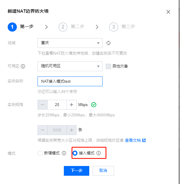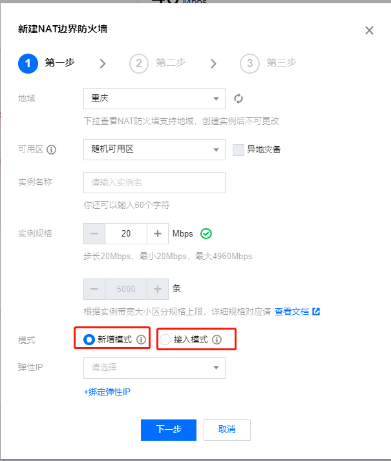 2. “新建 NAT 边界防火墙”弹窗中,可为当前账号创建一个新的 NAT 边界防火墙实例,填写相关字段,选择需要使用的模式,单击下一步。