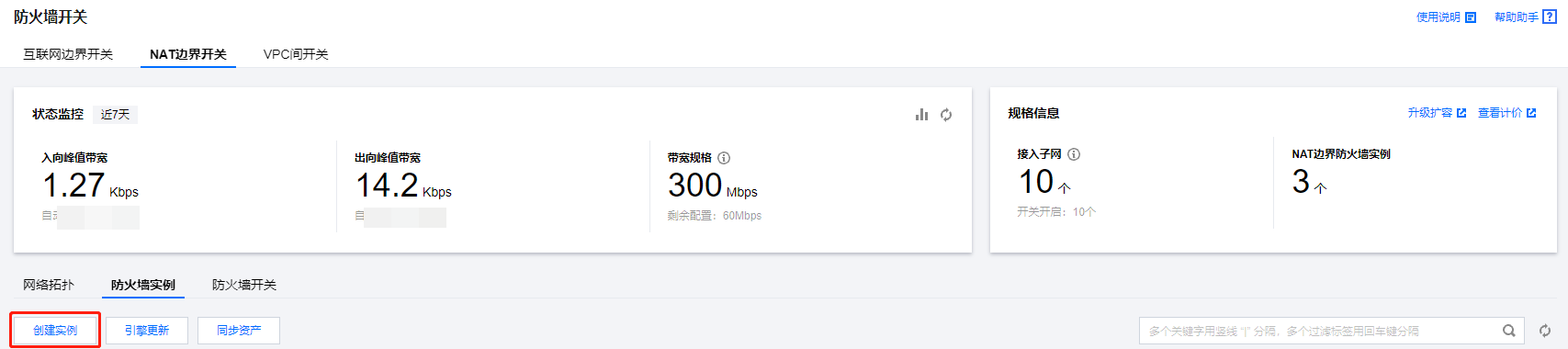 - 登录云防火墙控制台,在左侧导航栏中,选择防火墙开关 > NAT 边界开关。在 NAT 边界开关页面,可进行创建实例、同步资产、查看并监控基于 NAT 边界的带宽情况等操作。在 NAT边界开关下,单击创建实例。