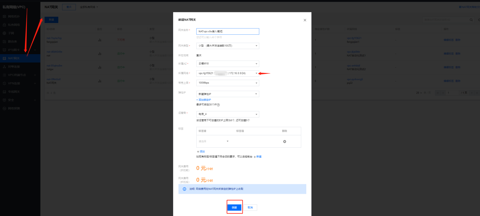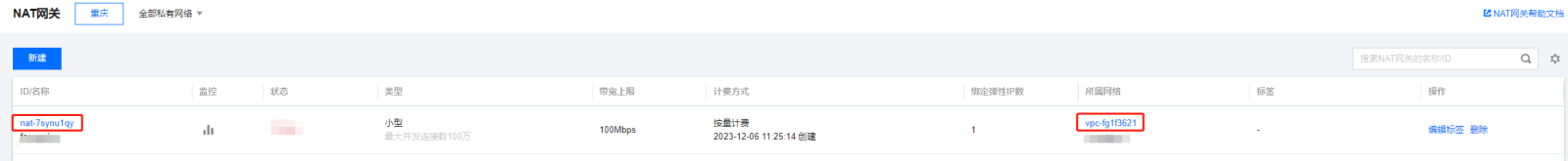 - VPC网络-->NAT网关-->新建NAT网关-->配置对应需要接入VPC