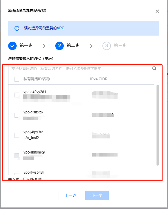 3. 第二步,选择需要接入云防火墙的VPC,单击下一步。